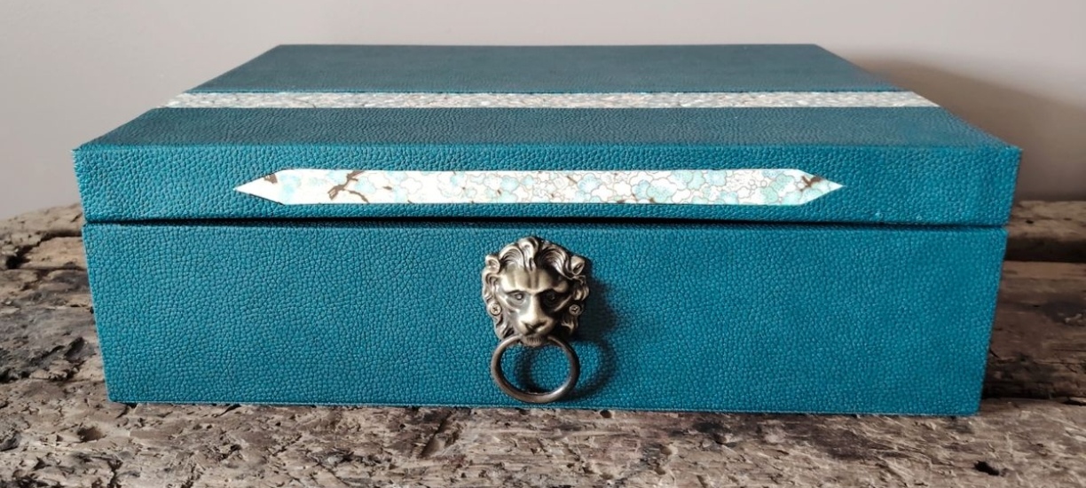 N°5 : Modèle fermeture en chapiteau. Simili cuir buffle grainé Bleu paon. Papier lokta or fond bleu canard. Décoration frontal bronze fin 19ème Dimensions : 37 x 26 x 15 cm Prix sur demande